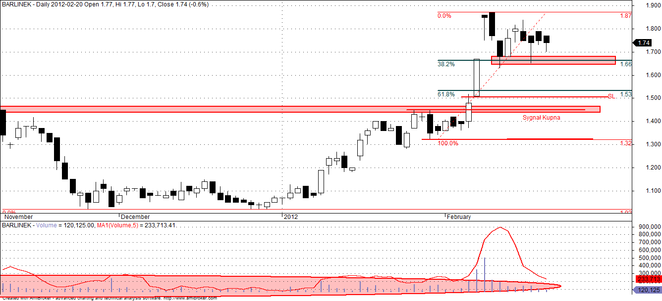 Po długo oczekiwanym wybiciu w końcu ono nastąpiło. Obecnie możliwa jest krótka konsolidacja i krótkie zejście do poprzednich poziomów. W średnim terminie papier wszedł w trend wzrostowy i mamuy nadzieje, że ta tendencja się utrzyma. SL pozstawiamy jeszcze na tym samym poziomie.